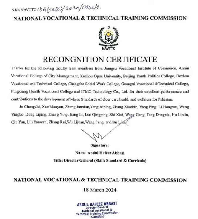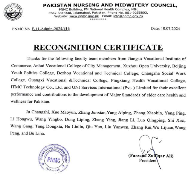 近日,公司智慧养老专业教师参与制定的“巴基斯坦老年照护专业标准开发项目”获得巴基斯坦老年照护专业标准国家职教委认证和巴基斯坦卫生部助产与护理委员会认证。