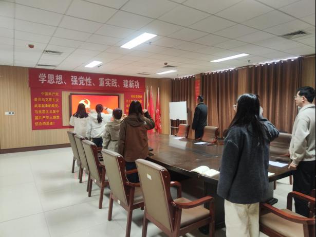首先组织党员签到,奏唱国歌,重温入党誓词。