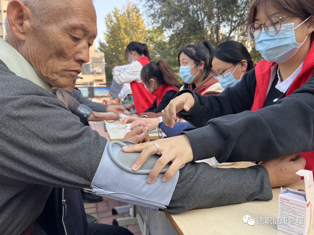 青年志愿者们在社区工作人员协助下,开展了“金晖健康”重阳节主题志愿服务活动。智慧健康养老与服务专业的志愿者们耐心地为老人测量血压、血糖、血氧,并科普老年保健常识,提高老年人对于高血压、高血糖等疾病的预防意识,引导老年人养成健康的生活习惯。