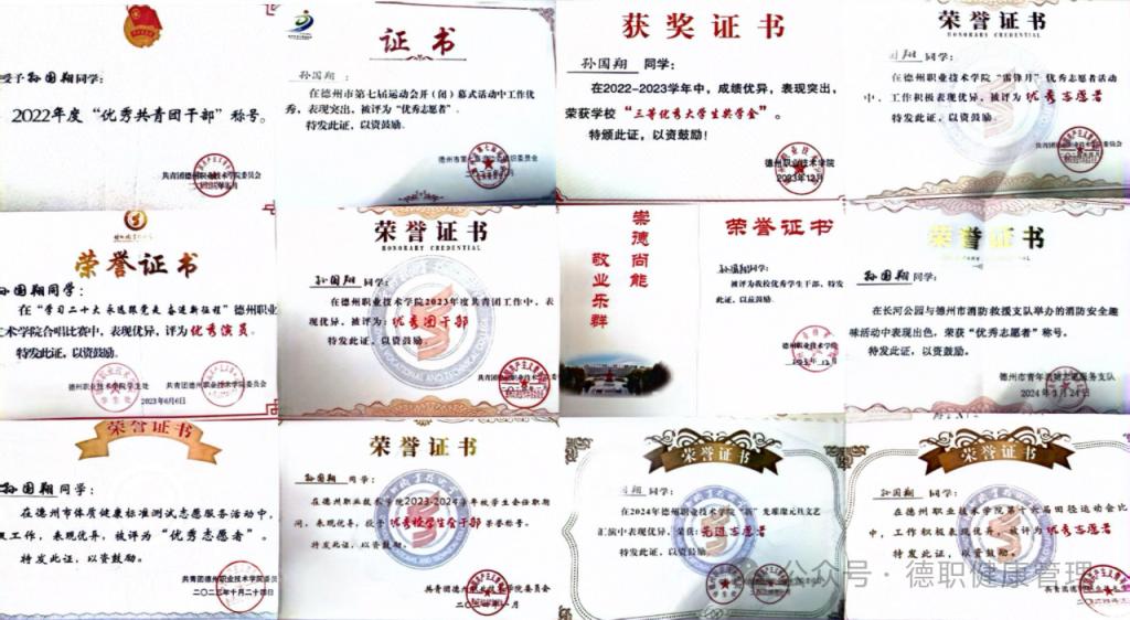 2022年bv伟德国际体育优秀共青团干部2023年6月学习二十大永远跟党走奋进新征程评为优秀演员2023年bv伟德国际体育三等奖学金2023年德州市体制健康测试评委优秀志愿者2023德州市第七届运动会评为优秀志愿者2023年bv伟德国际体育优秀员工干部2023年bv伟德国际体育优秀团干部2024年bv伟德国际体育优秀校员工会干部2023年山东省高等公司省级优秀员工2024年2月共青团山东省委2023年度“百万老员工进社区”先进个人