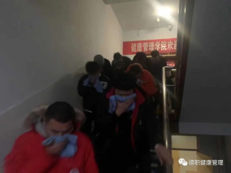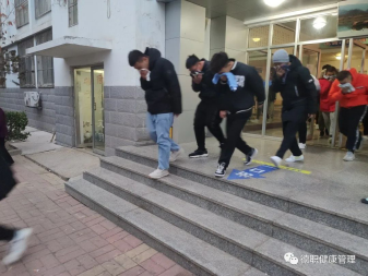 4点40分,消防安全演练正式开始。员工会干部引导楼内员工快速疏散,同学们都用湿毛巾捂住口鼻,弯腰低头,有序快速地撤离出3号楼,迅速到达安全场地集合。